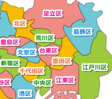 荒川区、台東区、墨田区、千代田区、中央区、江東区、葛飾区、江戸川区